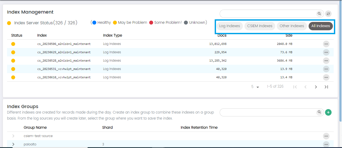 Indexes can be filtered as log indexes, CSIEM indexes, other indexes and all indexes.