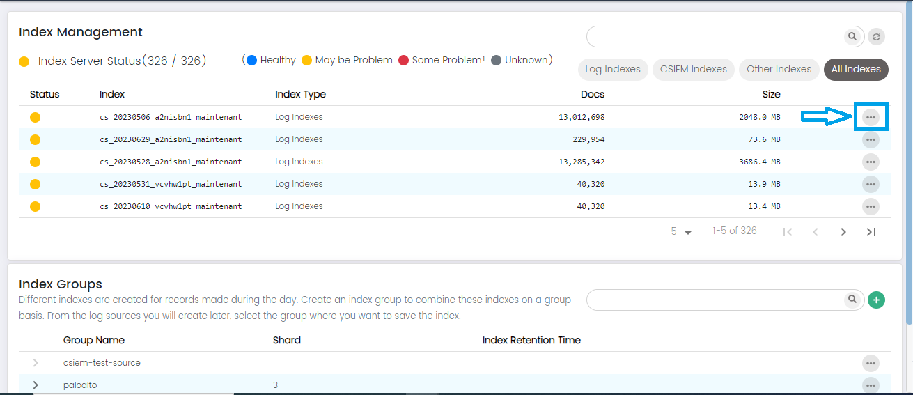 Index Management page of CSIEM, you'll find a comprehensive set of informative columns and additional fields that provide essential details about the data indexes used for storing and managing your security and event data.