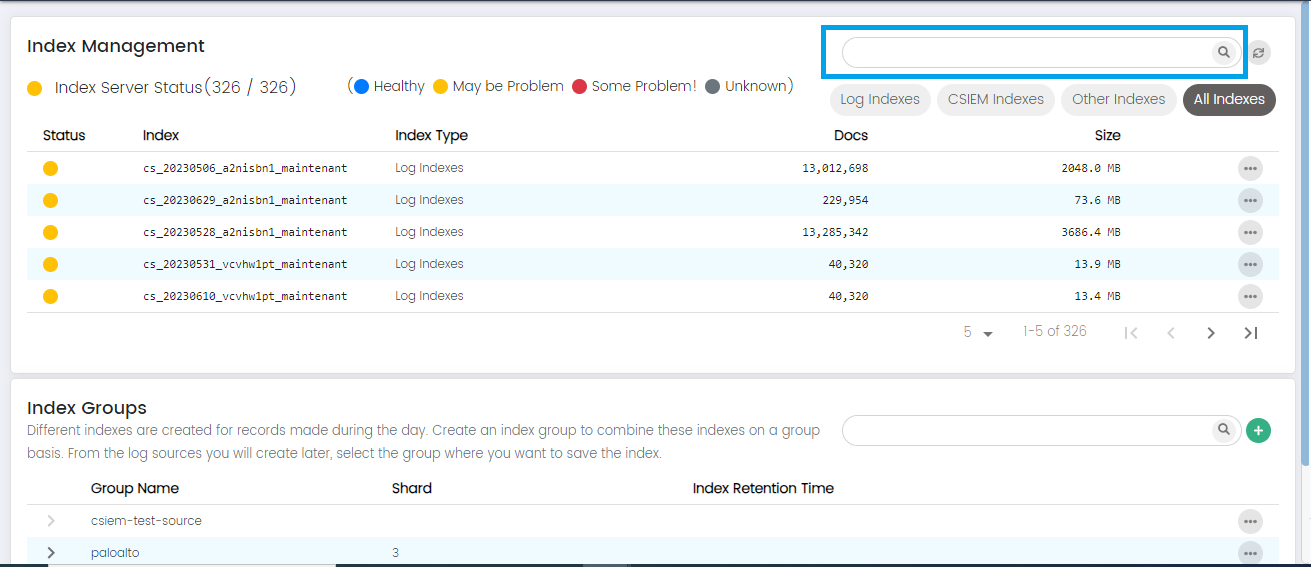 Search: The "Search" option on the Index Management page enhances your ability to locate specific indexes within CSIEM efficiently.